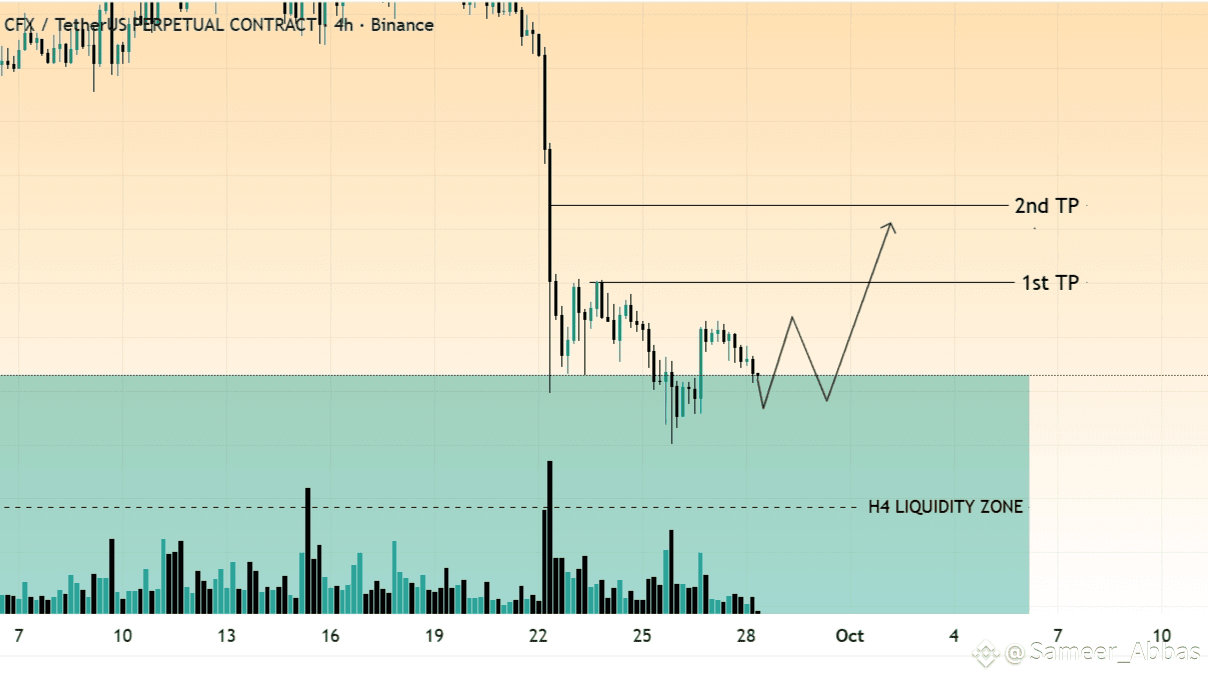 $CFX alcança nosso nível de Liquidez+FVG que é uma zona de alta probabilidade, no prazo H4 o CISD foi completado com outros sinais de volume de compra e agora podemos esperar um retorno do nível de $0.14159.