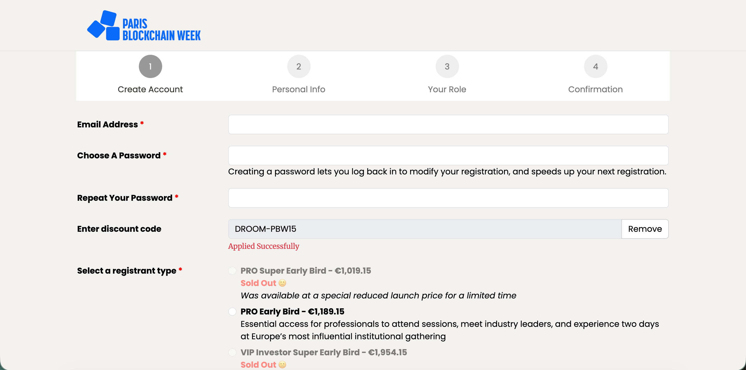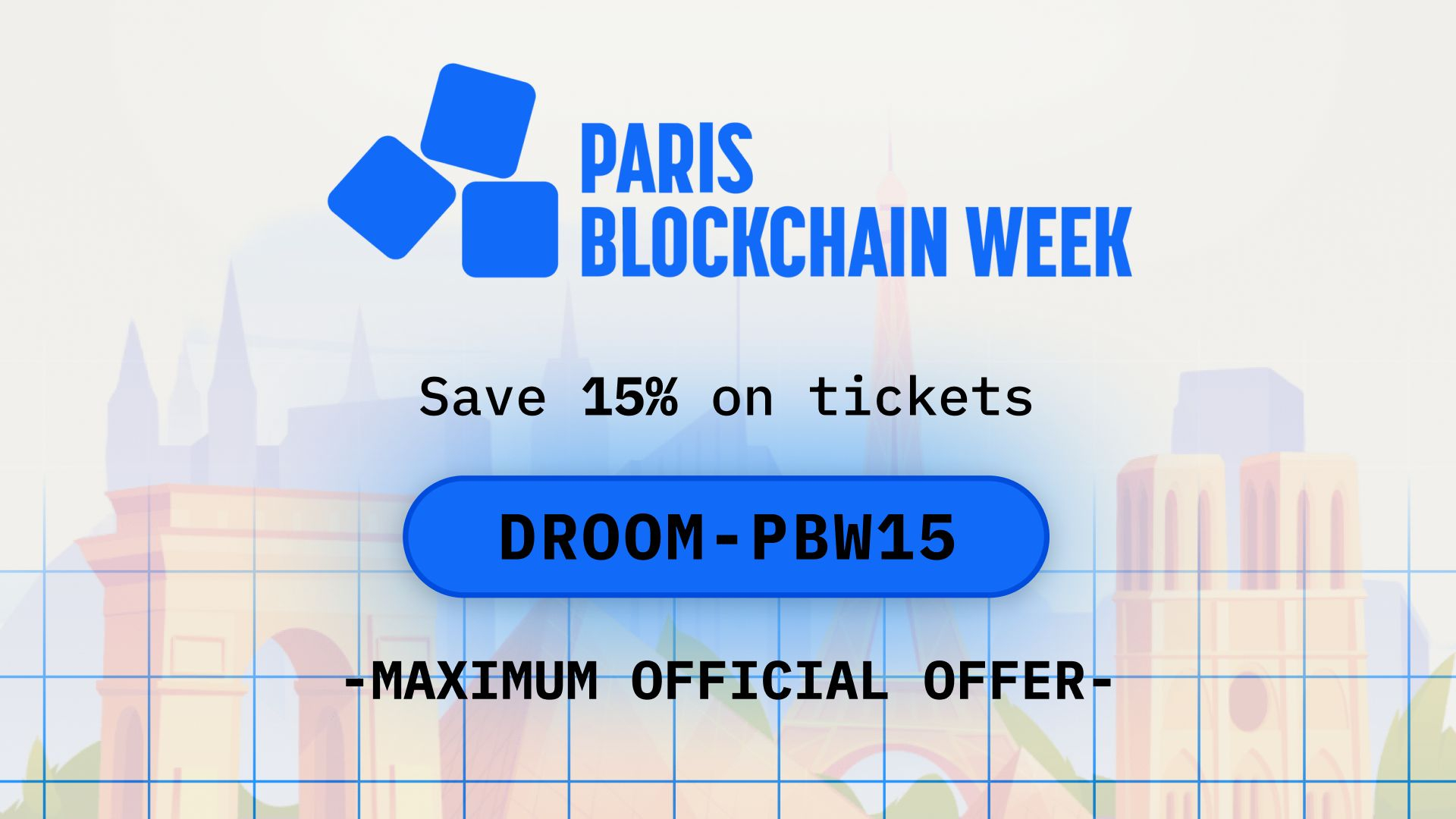 Link direto para os ingressos da Paris Blockchain Week — use o código de desconto DROOM-PBW15 no checkout para suas economias de 15%.