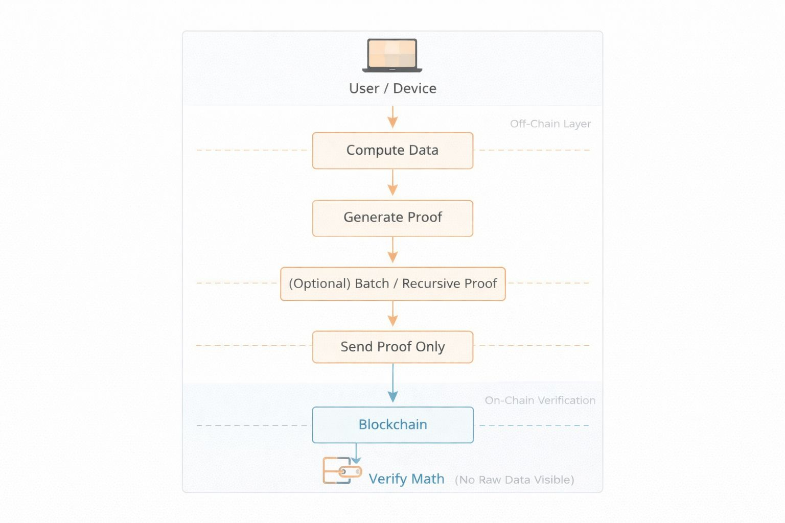 There’s this off-chain proving model they use, and once it clicked, everything made more sense. Basically, your real data like balances, trades, and identity stuff never actually goes on-chain. Computation is pushed off-chain, often to the user side or external environments, and you generate a proof that says “this is valid,” then send only that proof. So the chain isn't seeing your activity. It’s just verifying the math and moving on.
