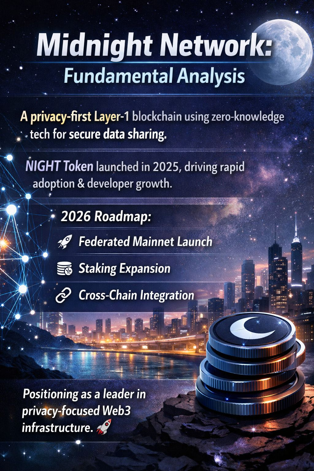 $NIGHT @MidnightNetwork A Midnight Network é uma blockchain de camada 1 focada em privacidade, construída com tecnologia de conhecimento zero, permitindo o compartilhamento seguro de dados sem expor informações sensíveis. Seu token NIGHT foi lançado em 2025, impulsionando a rápida adoção e o crescimento de desenvolvedores. A Midnight Network se concentra em um roadmap de 2026: lançamento da mainnet federada, expansão de staking e integração entre cadeias—posicionando-a como uma forte concorrente na infraestrutura Web3 focada em privacidade. 🚀 �