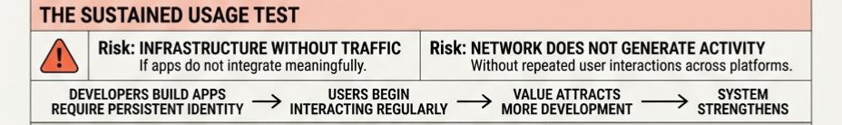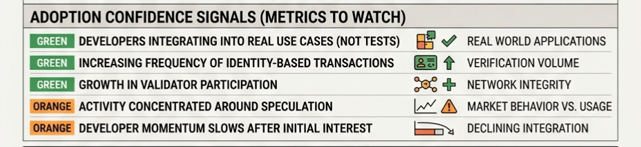 Então, o que me faria ter mais confiança neste projeto não é o movimento de preço de curto prazo, mas sinais consistentes de adoção. Eu gostaria de ver desenvolvedores integrando identidade em casos de uso reais, não apenas em ambientes de teste. Eu também procuraria uma frequência crescente de transações baseadas em identidade, o que sugeriria que os usuários realmente estão dependendo do sistema. O crescimento na participação de validadores seria outro sinal positivo, já que reflete confiança na manutenção da rede. Ao mesmo tempo, eu ficaria mais cauteloso se a atividade permanecer concentrada em torno da especulação em vez do uso, ou se o impulso dos desenvolvedores diminuir após o interesse inicial. Portanto, se você está acompanhando este projeto, provavelmente faz mais sentido focar em quão frequentemente as identidades estão sendo criadas e usadas, em vez de como o preço do token se move no curto prazo. Em mercados como este, narrativas fortes podem atrair atenção rapidamente, mas não sustentam sistemas por si mesmas. A diferença entre uma ideia que desaparece e uma infraestrutura que dura geralmente se resume a se as pessoas continuam a usá-la quando a empolgação inicial se vai.