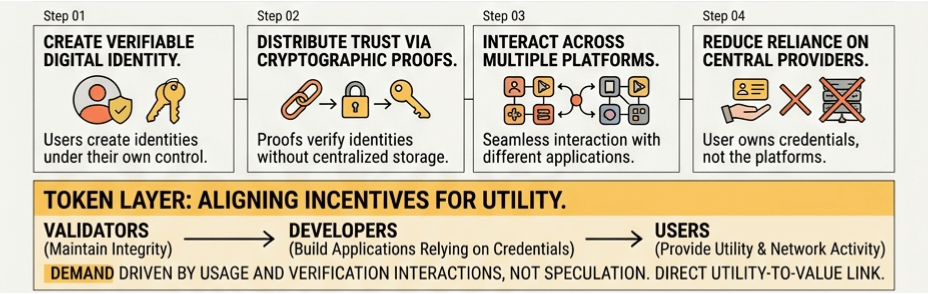 Pelo que entendo, o protocolo foi projetado para permitir que os usuários criem identidades digitais verificáveis que podem interagir em várias plataformas enquanto permanecem sob seu controle. Em vez de armazenar a identidade em um único lugar, ele distribui a confiança por meio de provas criptográficas. Em termos simples, permite que um usuário prove quem ele é ou o que ele pode fazer sem expor dados desnecessários. Uma maneira útil de pensar sobre isso é como fazer login em vários aplicativos com a mesma conta, exceto aqui o usuário possui as credenciais em vez da plataforma. Isso é importante porque reduz a dependência de provedores de identidade centralizados enquanto ainda mantém a interoperabilidade, o que é crítico se as aplicações devem compartilhar dados do usuário de maneira segura. A camada de token parece apoiar este sistema alinhando incentivos entre validadores, desenvolvedores e usuários. Os validadores são responsáveis por manter a integridade das provas de identidade, enquanto os desenvolvedores criam aplicações que dependem dessas credenciais. Se o design funcionar como pretendido, a demanda pelo token deve vir do uso real, e não apenas da especulação, já que cada interação que requer verificação contribui para a atividade da rede. Isso cria uma relação mais direta entre utilidade e valor, algo que muitos projetos de identidade têm lutado para alcançar.