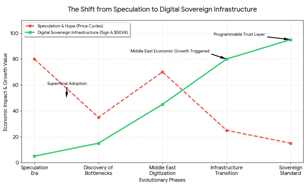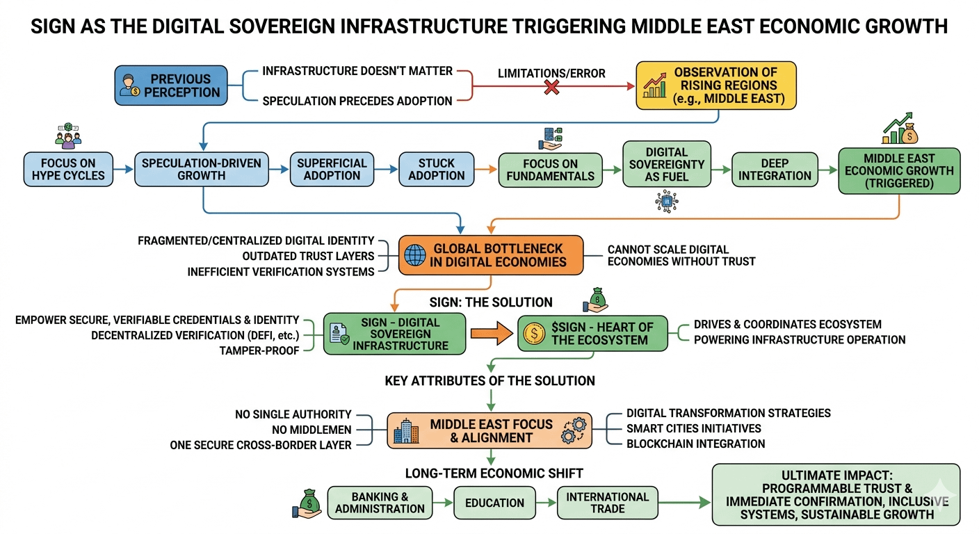 The greatest error I have used in crypto was that infrastructure does not matter as long as prices increase. Since time immemorial, I have assumed that speculation would precede adoption. That in case real world use was to eventually meet, people had to trade enough tokens. However, observing the rising regions, in particular, the Middle East, made that point of view entirely different. Hype cycles are not fueling growth there. It is being influenced by something much more fundamental: digital sovereignty. And that is precisely where Sign and SIGN begin to add up in a manner with which most people still have not gotten it.
