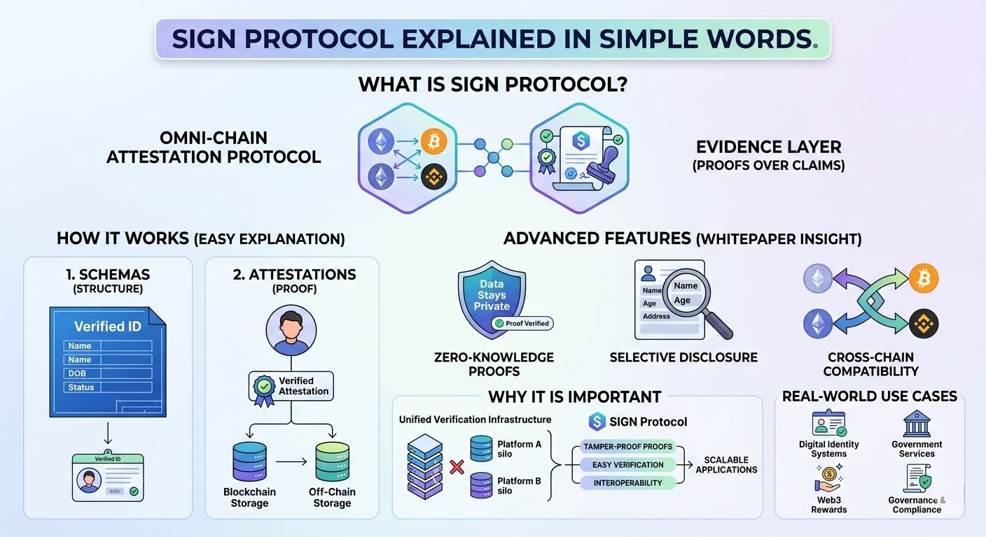 Ye basically ek “evidence layer” hai jahan kisi bhi claim ko proof ke saath attach kiya jata hai. Matlab agar koi kehta hai ki “maine course complete kiya” ya “meri identity verified hai”, to SIGN Protocol us claim ko digitally sign karke store karta hai, jise baad me verify kiya ja sakta hai.