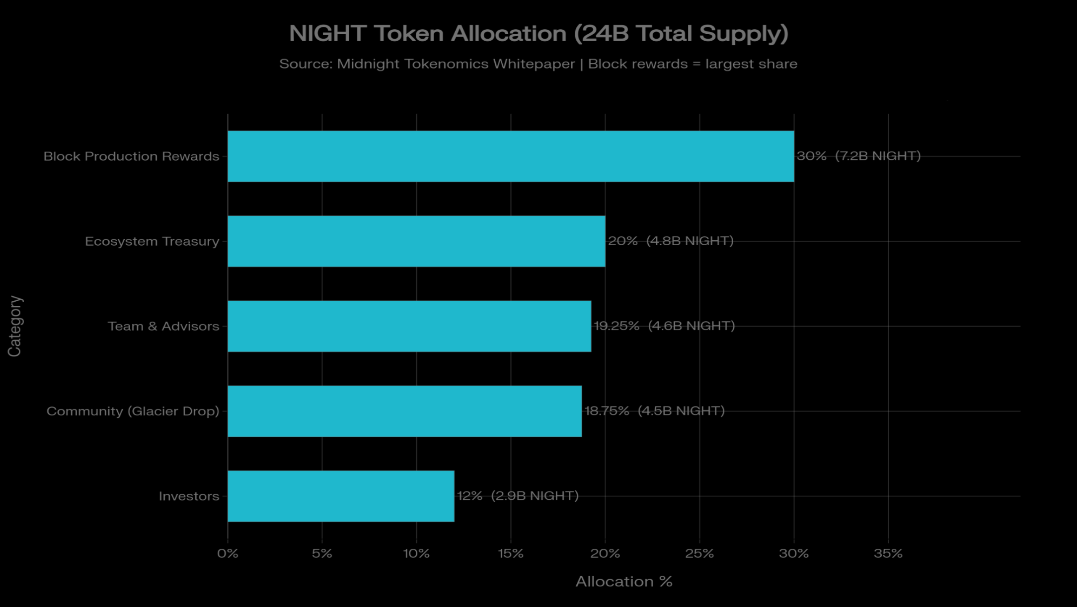 The distribution side also explains why the chart can feel noisy, tbh. Midnight says more than 3.5 billion NIGHT were claimed by 170,000+ wallet addresses in the Glacier Drop, and Binance separately allocated 240 million NIGHT through its HODLer Airdrops program, equal to 1% of total supply.