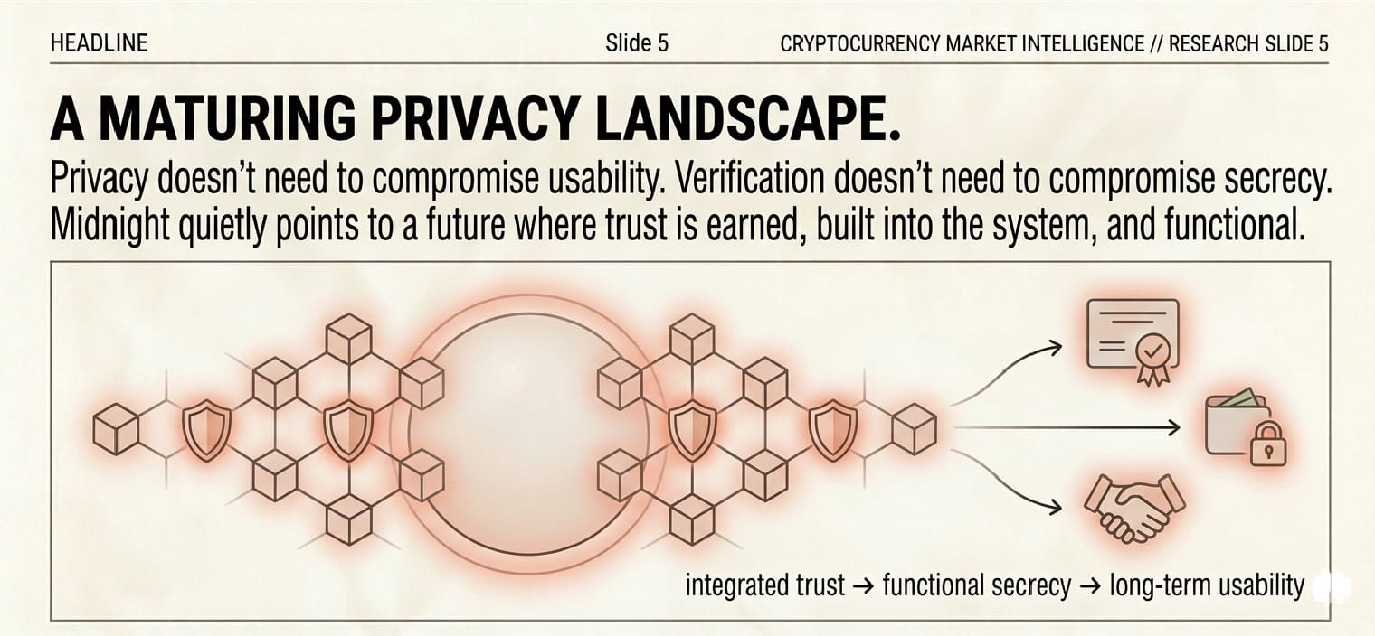 What gets me most is just how subtle Midnight’s approach is. You don’t see it in loud graphics or wild PR campaigns—the shift happens underneath. Privacy doesn’t have to kill usability. Verification doesn’t always mean breaking secrecy. Trust doesn’t mean giving up control. That’s rare, and it’s a big reason analysts see Midnight as a marker for a maturing privacy landscape—something other networks might copy down the road.