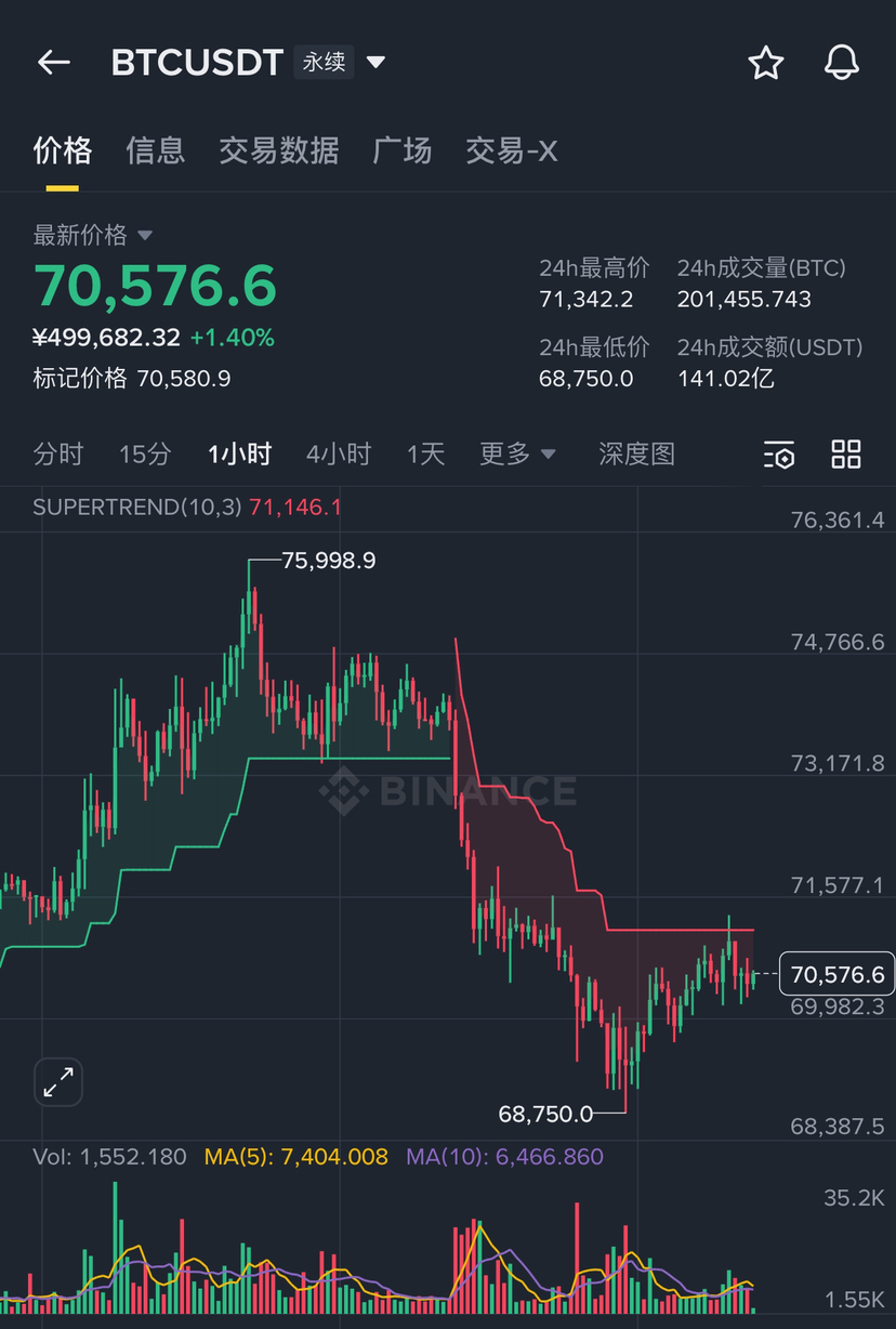 大饼70,576,以太2,148,表面上今天是绿的,涨了1.4%和-0.42%,但别被这个数字骗了。你看图,大饼从75,998的高点一路跌到68,750,跌了将近7,300刀,以太从2,385跌到2,098,将近300刀没了。现在的小反弹,是真的站稳了,还是死猫弹?SuperTrend 1H全线还是红的,这个问题的答案还没出来。