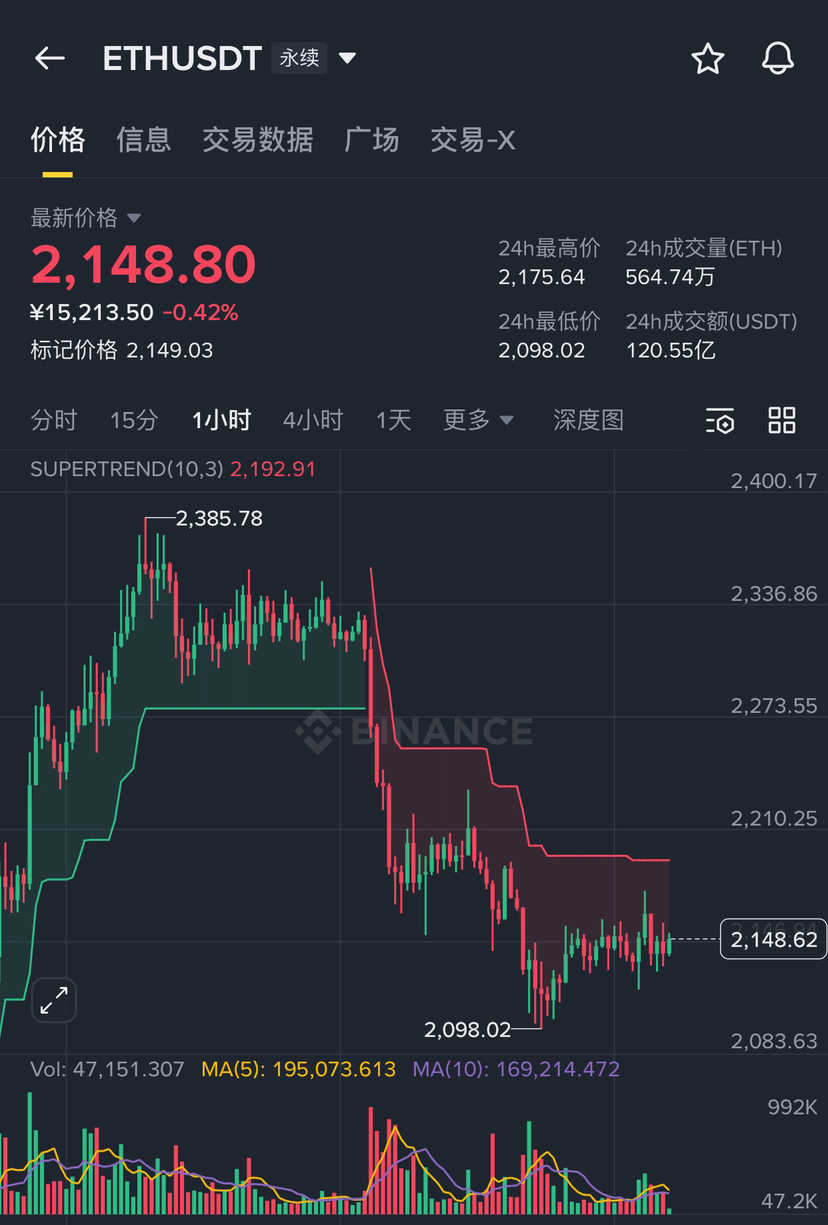 以太的跌幅更夸张。从2,385跌到2,098,跌幅将近13%,比大饼跌得更狠。现在2,148,SuperTrend 1H阻力在2,192,离现价还有44刀的距离。今日最高2,175,同样没能突破阻力就回来了。量能47,151,MA5是195,073,MA10是169,214,量能不到均线的三分之一,和大饼一样——反弹没量,说明接盘意愿不强,持币的人都在等机会出。