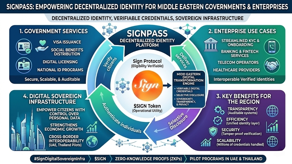 In the digital age, identity is the foundation of trust. Governments and enterprises in the Middle East face a growing need for secure, scalable, and privacy-preserving systems to verify citizens, manage services, and distribute benefits efficiently. @SignOfficial SignPass, powered by the $SIGN token, provides a transformative solution: a decentralized identity platform that redefines how governments and businesses authenticate individuals while maintaining sovereignty, transparency, and privacy.