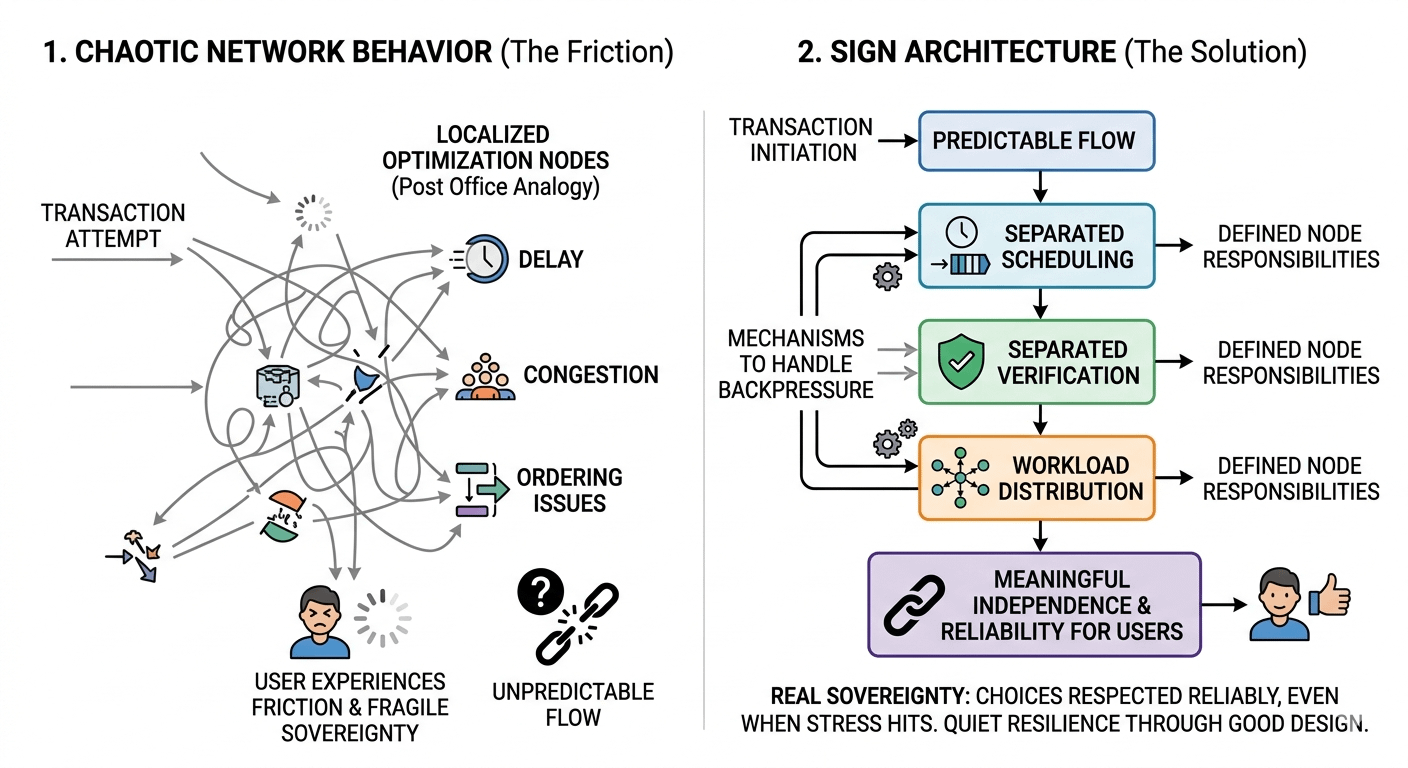 When I look at how Sign approaches these challenges, I see an attempt to organize the chaos rather than just promise speed or freedom. The design separates scheduling, verification, and workload distribution in ways that make the flow more predictable. Nodes have defined responsibilities, and there are mechanisms to handle backpressure so one slow part doesn’t stall everything else. From a system perspective, it feels like someone is trying to balance autonomy with reliability but it also makes me wonder how much of that “sovereignty” is really experienced at the user level.
