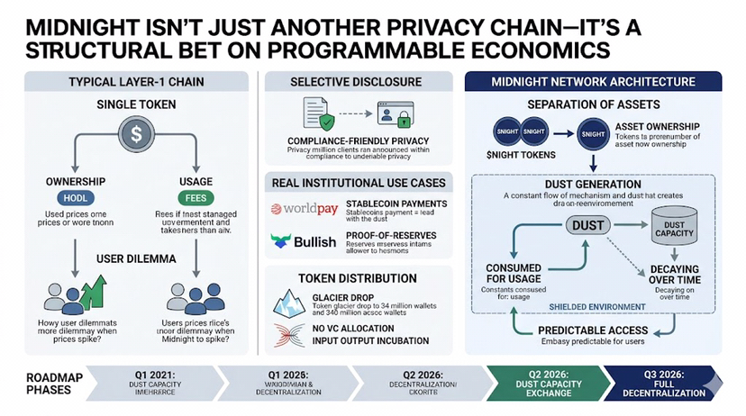 That structure solves a problem that has quietly plagued every major layer-1 blockchain. Think about it: on Ethereum or Cardano or Solana, the same token you believe in as a long-term investment is the one you have to spend when the network gets congested. When prices spike, usage becomes prohibitively expensive. When prices crash, security budgets get squeezed. Midnight breaks that cycle. You hold NIGHT, it passively generates DUST, and that DUST handles the operational costs regardless of what the market price of NIGHT is doing . It’s a design choice that prioritizes predictable access over speculative volatility, and it shifts the incentives toward long-term participation rather than short-term trading.