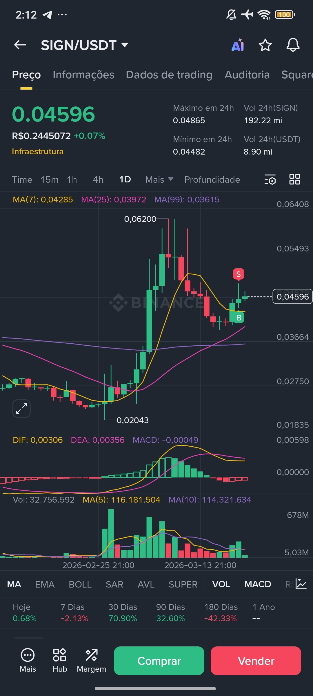 Olhando o gráfico 1D agora, o MACD ainda está ligeiramente positivo (DIF: 0,00306) mas com histograma encolhendo — sinal de momentum fraco no curto prazo. Suporte imediato na região do MA(99) em 0,03615. O token saiu de $0.02043 em fevereiro e chegou a bater $0.06200 no pico — uma estrutura de pump seguida de distribuição que ainda está se resolvendo. Máximo nas últimas 24h foi $0.04865, mínimo $0.04482, com volume de 192 milhões de SIGN negociados. Preço atual rondando $0.04596. Mercado em compasso de espera.