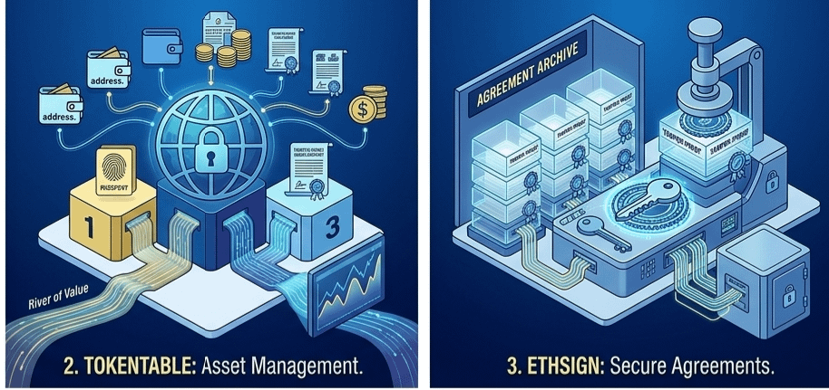 * EthSign (Camada de Assinatura de Acordos): Move contratos legais e acordos soberanos totalmente on-chain. Garante que todas as interações comerciais sejam rastreáveis, nunca perdidas e nunca alteradas unilateralmente.