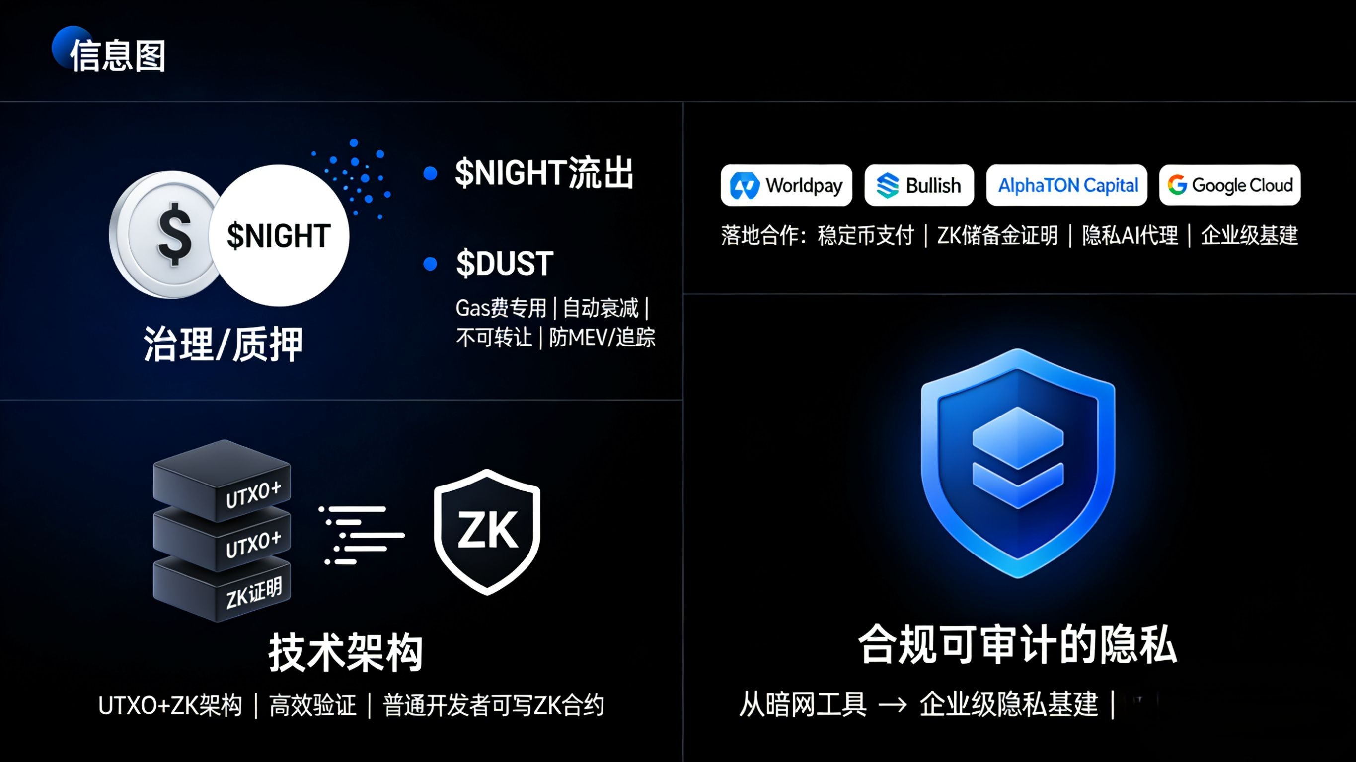 最让我服气的是他们的双代币模型。NIGHT 和 DUST 分开这事儿,一开始我觉得花里胡哨,后来看明白了——这设计是真有点东西。传统公链用同一个代币既当投资资产又当 gas,价格一涨链上活动直接卡死。Midnight 的思路是:NIGHT 负责治理和质押,持有 NIGHT 自动生成 DUST,DUST 专门用来付 gas,而且 DUST 会衰减、不可转让,没法被投机。这意味着隐私交易的元数据不会被链上追踪,MEV 想抢跑都找不到路径。这个“理性隐私”的设计逻辑,确实比 Zcash 那种“要么全黑要么全白”高了一个维度。
