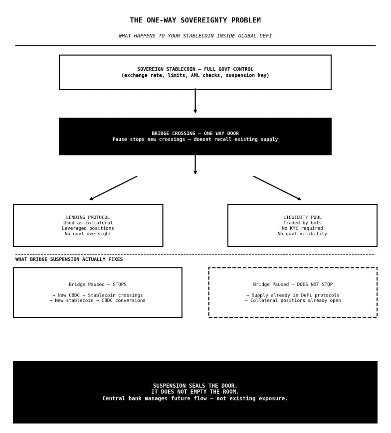 the whitepaper describes the bridge controls clearly and accurately. what it does not describe is any mechanism for the central bank to interact with stablecoin supply that has already left the bridge and entered public DeFi