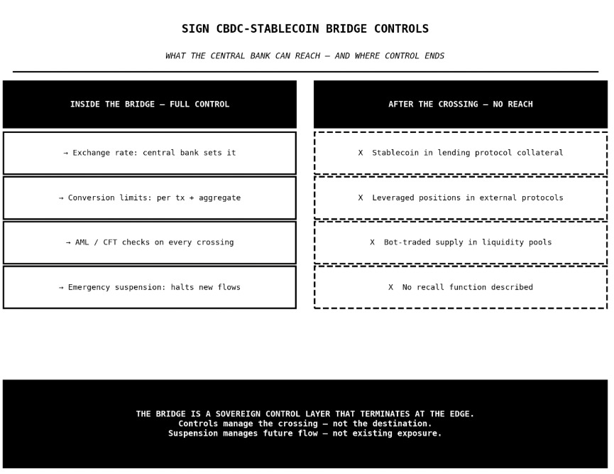 exchange rate management means the central bank is not just watching the peg - it is actively setting the terms of conversion. conversion limits mean large-scale capital flight through the bridge can be throttled before it becomes a systemic event. the compliance layer means the bridge is not a KYC-free exit route from a regulated CBDC system into anonymous public chain activity.