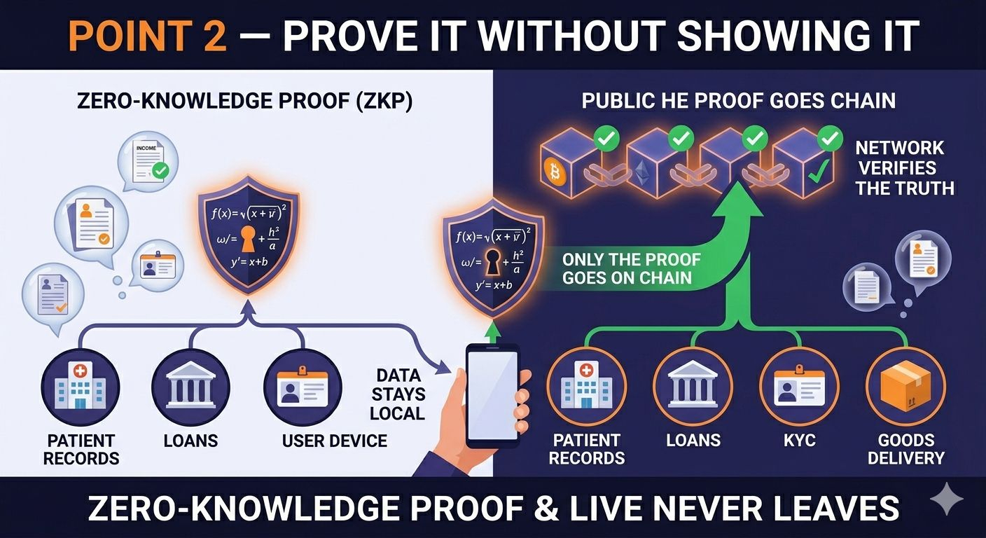 Isso funciona através de algo chamado provas de conhecimento zero. Um método matemático que permite provar que uma afirmação está correta sem compartilhar os dados por trás dela. Apenas a prova vai para a cadeia. Os dados reais permanecem em seu dispositivo. Ninguém mais nunca os vê.