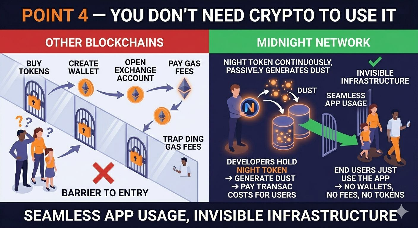 Um paciente usando um aplicativo de consentimento hospitalar na Midnight nunca compra um token. Nunca abre uma carteira. Nunca pensa sobre taxas de gás. Eles apenas usam o aplicativo. A blockchain é completamente invisível para eles.