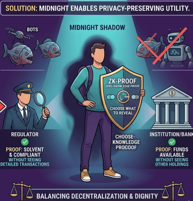 No velho mundo (e no atual DeFi), se você precisa provar que está solvente, tem que entregar todo o seu extrato bancário. Você revela seu nome, sua história e aquele café de $3 que comprou às 2:00 da manhã. Tudo. A meia-noite vira o jogo. Usando provas ZK, posso provar a um regulador ou a um parceiro que estou em conformidade e tenho os fundos sem mostrar uma única transação. Posso provar que sou maior de idade sem mostrar meu aniversário. Posso provar que possuo 100 ETH sem revelar qual carteira está.
