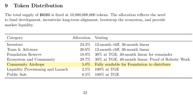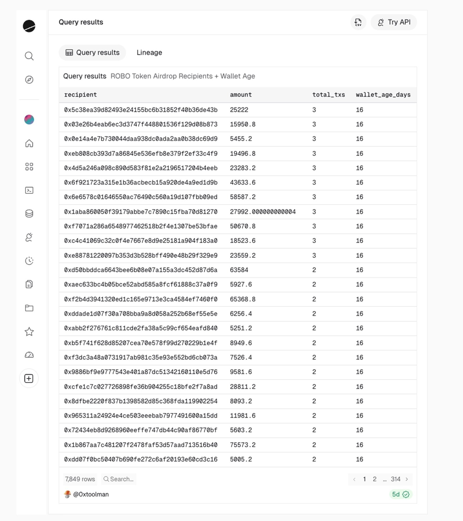 Este ator desconhecido implantou mais de 7.000 carteiras recém-criadas antes do airdrop. Através dessas carteiras, a entidade reivindicou 199 milhões de tokens ROBO, representando 40% da alocação total do airdrop da comunidade. Na época do lançamento do token, esse estoque foi avaliado em cerca de $8 milhões.