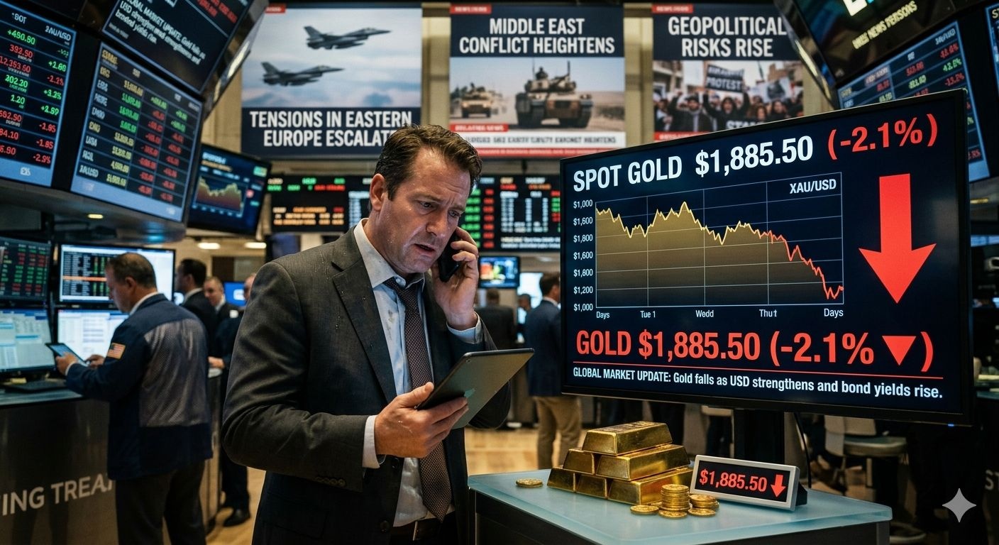Os preços do ouro estão caindo apesar das crescentes tensões globais (particularmente o conflito EUA-Irã) devido a pressões macroeconômicas predominantes. As principais razões incluem: