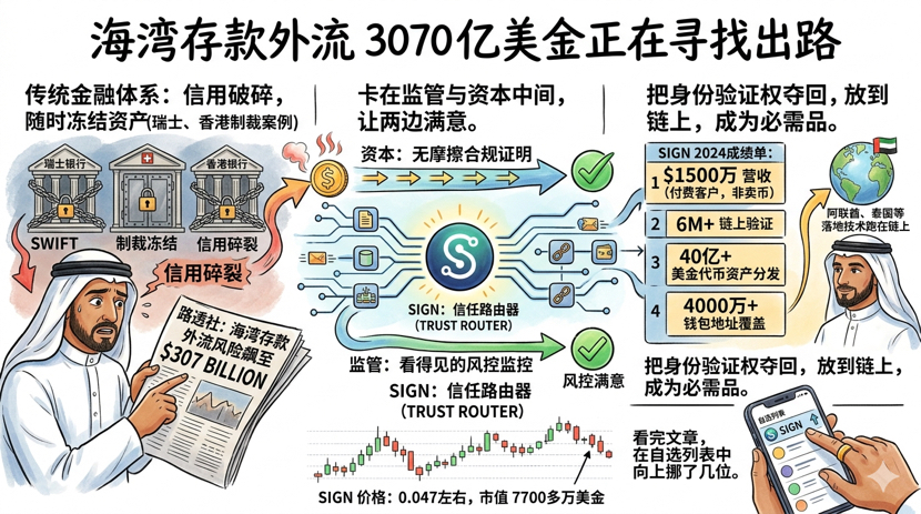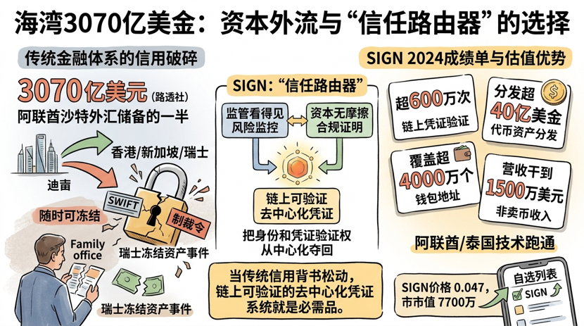 我的第一反应不是“这钱要去哪”,而是“这钱凭什么信你”。你从迪拜把钱转到香港、转到新加坡、转到瑞士,然后呢?瑞士去年冻了俄罗斯人几百亿资产,信用早就碎了一地。香港的银行一样受制于SWIFT。只要钱还在传统金融体系里,哪天制裁令下来,说冻就冻。@SignOfficial