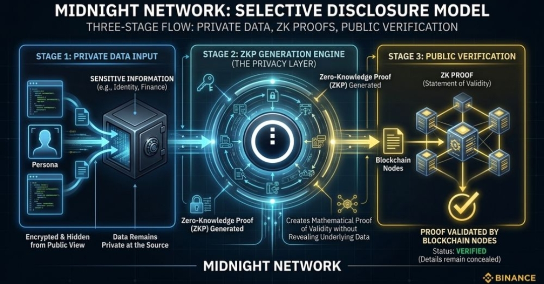 Here’s the simple real-life scenario I keep thinking about. Imagine a lender, exchange, or payroll app that needs to verify you meet a rule, like being over 18, living in an approved jurisdiction, or passing a compliance check, but doesn’t need your full identity file sitting on a public chain forever. Midnight’s selective disclosure model is built for exactly that kind of interaction, using zero-knowledge proofs so an app can confirm the condition without exposing all the personal data behind it.