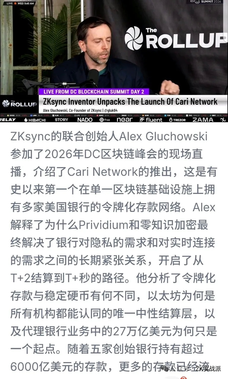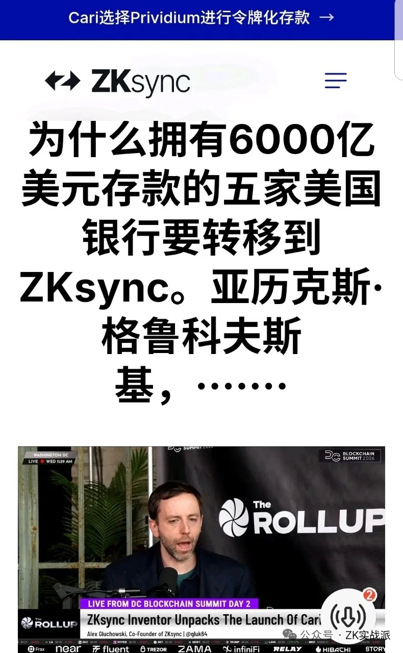 四、zkSync的未来:从扩容工具到金融基础设施 从早期ZK-Rollup技术落地,到如今承载千亿级银行存款,ZKsync已完成从“以太坊扩容工具”到“Web3金融基础设施”的蜕变。 未来,随着Cari Network逐步推进,更多金融机构将加入生态,ZKsync将成为连接传统金融与数字经济的关键桥梁,推动区块链技术真正走进主流应用场景。