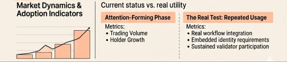 A assinatura permite que plataformas e moedas como $SIREN operem com camadas de identidade verificável, melhorando a confiança e a transparência nas negociações em cadeia e nas interações dos usuários. Mas se a identidade se tornar parte da camada fundamental, pode apoiar a coordenação entre setores como finanças, comércio e serviços públicos. A posição da Sign como infraestrutura soberana digital sugere uma tentativa de alinhar-se com essa mudança mais ampla. Trata-se menos de competir como outro projeto cripto e mais de se encaixar em uma transição econômica maior, onde os sistemas digitais precisam ser tanto escaláveis quanto verificáveis. Olhando para o lado do mercado, o projeto ainda parece estar em uma fase onde a atenção está se formando em vez de se estabilizar. A atividade tende a aumentar durante ciclos narrativos, o que é comum para projetos focados em infraestrutura que ainda não estão profundamente integrados nos fluxos de trabalho do dia a dia. Métricas como volume de negociação e crescimento de detentores podem indicar uma crescente conscientização, mas não confirmam necessariamente que o sistema está sendo usado de maneira significativa. Em situações como esta, o mercado frequentemente reflete expectativas sobre a adoção futura em vez da utilidade atual. Essa lacuna se torna importante porque define quanto da avaliação é baseada em crença versus uso real. Mas é aqui que o verdadeiro teste aparece. O maior desafio não é explicar a soberania digital ou mesmo construir o sistema técnico. É garantir que a identidade se torne parte de interações econômicas repetidas. Porque se as aplicações não integrarem a identidade de uma maneira que os usuários dependam consistentemente, a infraestrutura permanece subutilizada. E se o uso não alcançar um certo limiar, a conexão entre o token e a demanda real enfraquece.