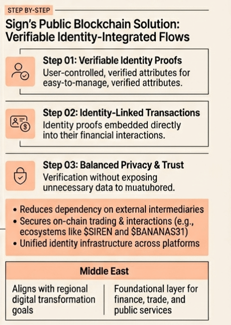 Eu me lembro de uma fase em que continuei perseguindo narrativas que pareciam estruturalmente importantes, mas nunca se traduziram em uso real. A identidade digital foi uma delas. A ideia parecia óbvia. Se os usuários controlassem seus próprios dados, as plataformas naturalmente se deslocariam para esse modelo. Na época, acreditei que o conceito em si era suficiente para impulsionar a adoção. Mas quando comecei a olhar mais a fundo em como esses sistemas foram implementados, percebi algo desconfortável. A maioria das soluções ou introduziu pontos centrais de controle ocultos ou exigiu esforço demais dos usuários para funcionar na prática. Essa experiência mudou a forma como avalio esses projetos. Agora eu presto mais atenção em se um sistema pode operar silenciosamente em segundo plano sem forçar os usuários a pensar sobre isso. Essa mudança de pensamento é o que fez a abordagem do Sign chamar minha atenção. Não porque a identidade digital é um novo conceito, mas porque ela levanta uma pergunta mais fundamentada. O que acontece quando a identidade não é apenas um recurso, mas uma camada central da infraestrutura financeira? Mais especificamente, a identidade pode se tornar incorporada em como os sistemas de moeda digital operam em regiões que estão ativamente construindo novas estruturas econômicas? Assim, a verdadeira pergunta se torna se esse modelo pode ir além de casos de uso isolados e apoiar a atividade econômica real em escala. De uma perspectiva estrutural, a abordagem de blockchain público do Sign é construída em torno de identidade verificável integrada diretamente aos fluxos de transação.