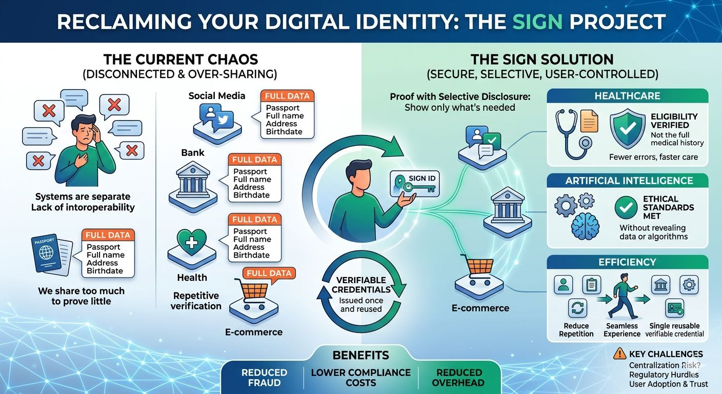 في كل مرة تفتح فيها حساباً جديداً على منصة رقمية، تجد نفسك عالقاً في الدوامة ذاتها: "أدخل بياناتك، أكد بريدك، ارفع صورة هويتك". وكأن العالم الرقمي الواسع يعاني من "فقدان ذاكرة" مزمن؛ ينسى من أنت في كل خطوة، ويجبرك على البدء من الصفر وكأنك غريب تماماً. وسط هذا التشتت الرقمي وغياب الثقة المتبادلة بين الأنظمة، يبرز مشروع SIGN ليس كأداة تقنية بحتة، بل كفلسفة جديدة تهدف لترميم الجسر المكسور بين الخصوصية والخدمات الرقمية.
