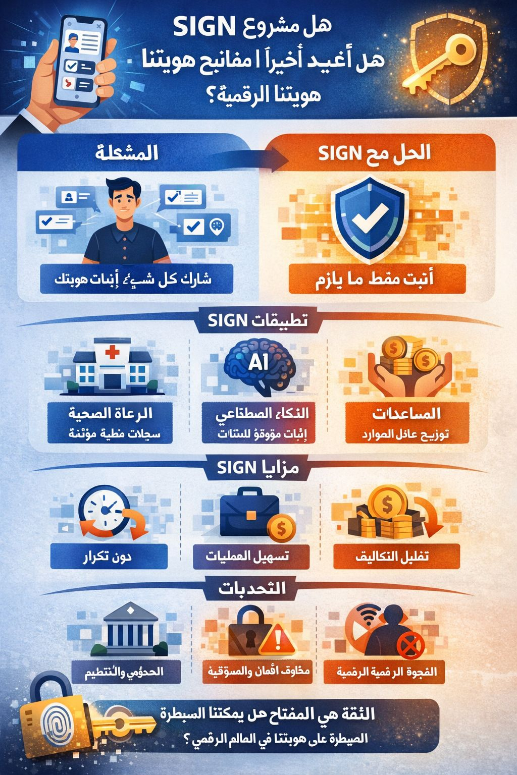 يمثل SIGN محاولة جادة لاستعادة السيطرة في عصر ضاعت فيه الخصوصية بين ركام "الموافقة على الشروط والأحكام". إنها رؤية طموحة لعالم نثبت فيه هويتنا بكرامة، دون أن نضطر لبيع أسرارنا مقابل خدمة. نجاح المشروع لن يقاس بمدى تعقيد خوارزمياته، بل بمدى قدرته على أن يصبح جزءاً غير مرئي، وموثوق، من حياتنا اليومية.