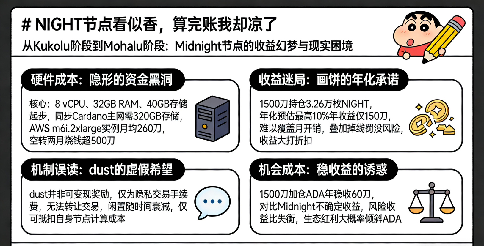 更让我犹豫的是机会成本,这1500刀如果拿去加仓ADA跟着Cardano生态走一年稳拿60刀收益,不用担节点掉线、机制变动的风险;就算去挖一些新上线的轻量级币种短线快进快出,收益也比守着Midnight空节点强。Hoskinson说Midnight是Cardano的伙伴链用ZK-proofs做数据隐私保护,说实话我对这个定位是认可的,也相信如果Midnight成了Cardano生态能跟着涨一波,但问题是NIGHT未必能分到多少红利,就算生态起来了涨得最多的大概率还是ADA,而如果Midnight没做起来NIGHT可能直接归零😨而ADA顶多小跌一点,这风险收益比完全不对等。