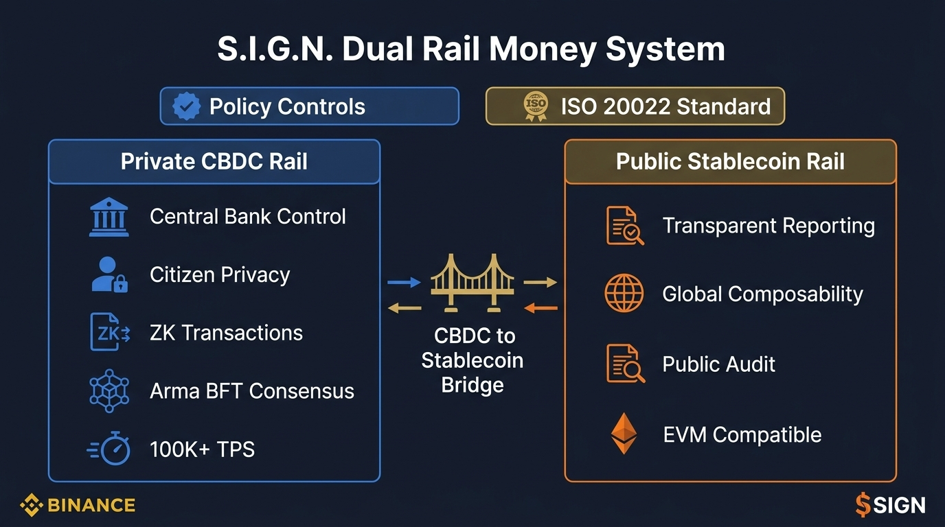 Mas aqui está o que me emociona sobre tudo isso. A arquitetura tem algo chamado design de trilho duplo. Existe um trilho público para operações transparentes, como relatórios governamentais ou pagamentos públicos de stablecoins. E há um trilho privado para operações sensíveis a cidadãos, como pagamentos de CBDC no varejo, onde a privacidade realmente importa.
