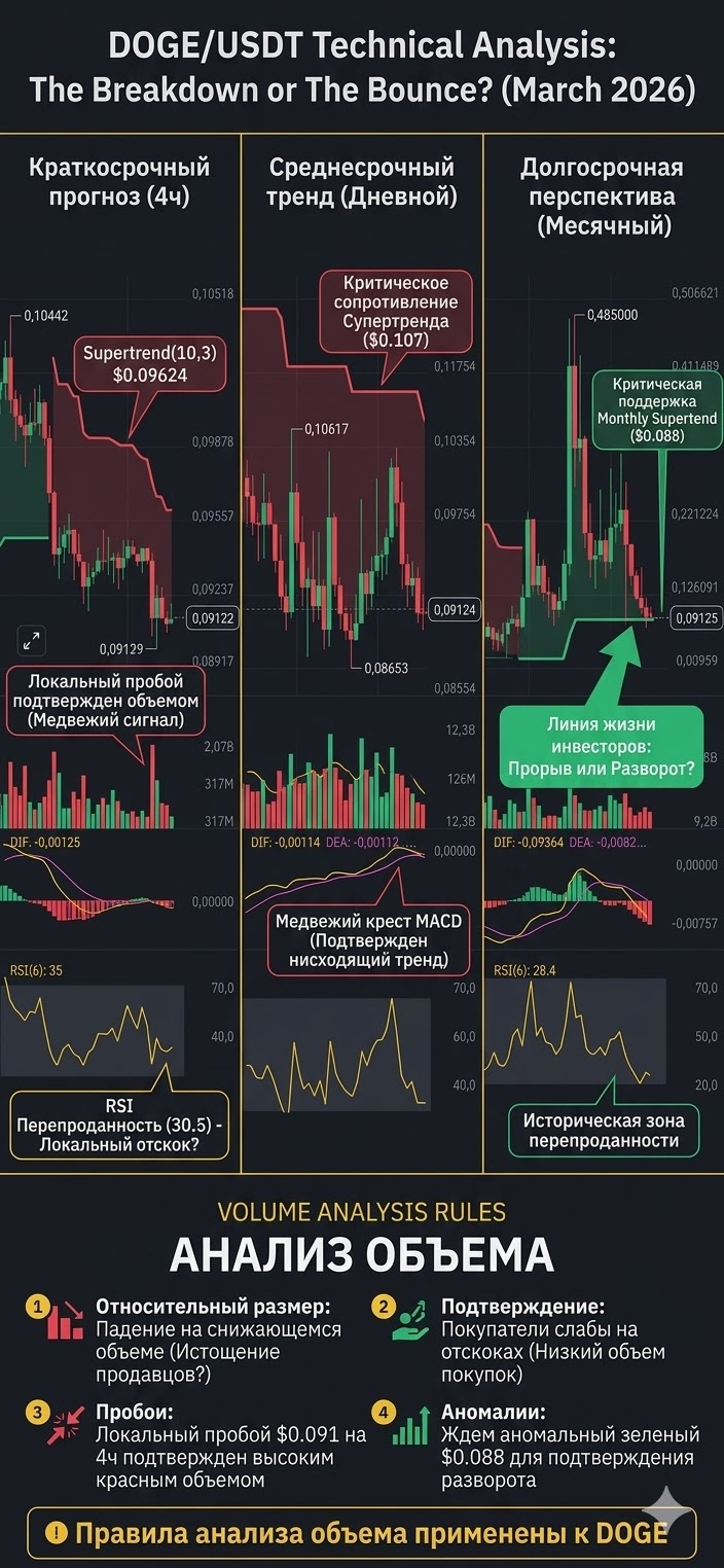 На 4-часовом таймфрейме мы видим, что пробой локальной поддержки $0.091 произошел на повышенном красном объеме (истинный пробой). Это медвежий сигнал. Уровни Супертренда ($0.096) и MACD (ниже нуля) подтверждают нисходящий тренд. НО: Посмотрите на RSI (RSI-6)! Он в зоне экстремальной перепроданности (около 30). Это сигнал о том, что актив слишком сильно упал и возможен технический отскок вверх. Но отскок, а не разворот тренда.