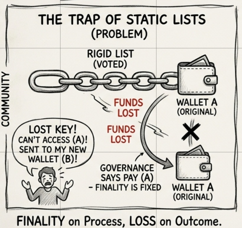 Esta é a crise mais profunda. Mostra que nosso mundo "descentralizado" ainda está funcionando com suposições centralizadas antigas. Tratamos uma "lista finalizada" como um PDF estático, quando na verdade precisamos de um Acordo Vivo—algo que permaneça honesto, mas que possa realmente respirar.