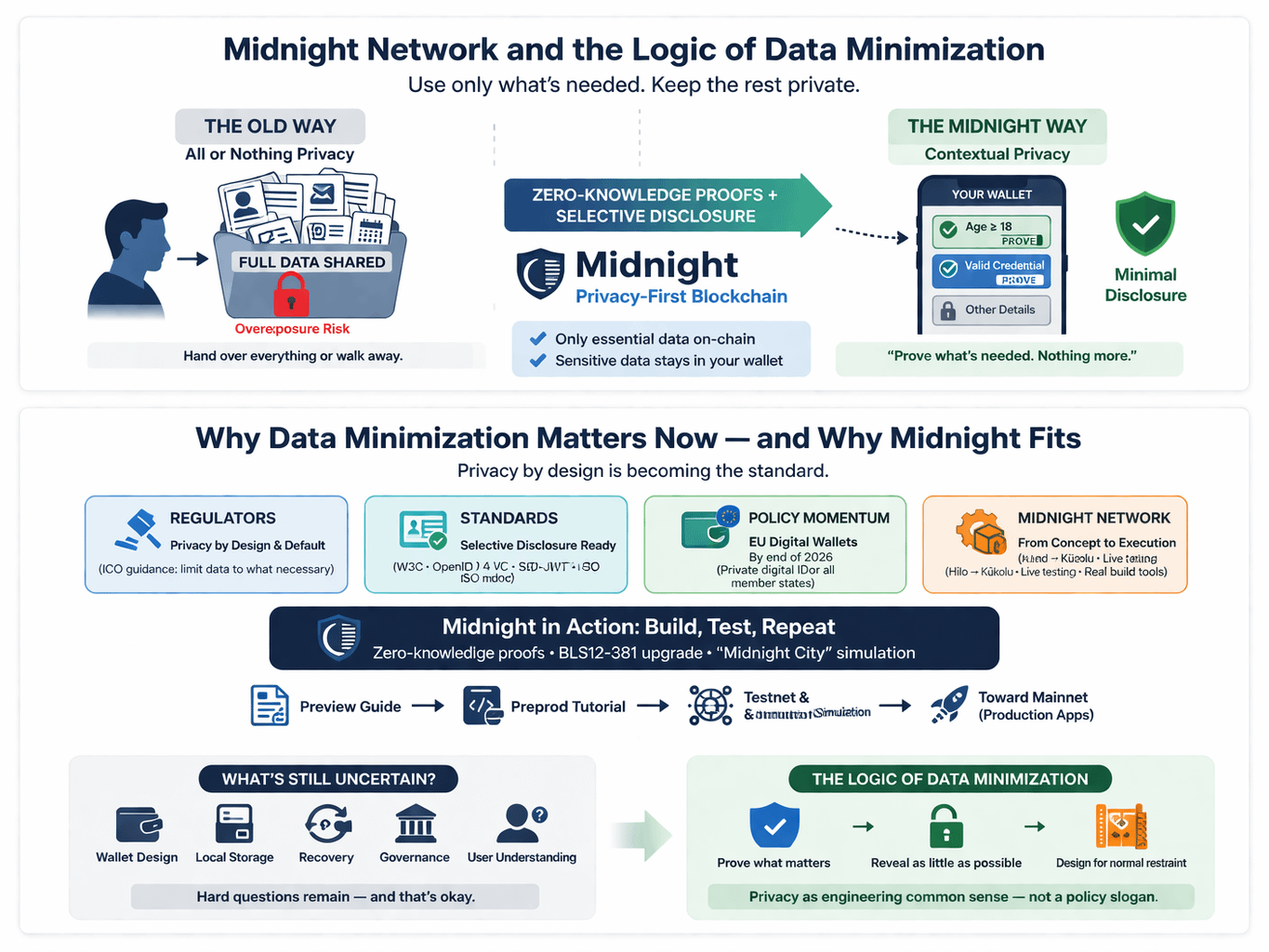 There is still plenty that remains uncertain and I think it is better to say that plainly. Keeping sensitive data off chain does not make the difficult questions disappear. It shifts them toward wallet design local storage recovery governance and the everyday reality of whether people actually understand what they are sharing and why. What surprises me is that this does not make the idea weaker. It makes it more honest because it treats privacy as something that must be worked through in practice rather than promised in the abstract. I find it helpful to look at Midnight less as a claim of perfect privacy and more as a serious attempt to apply a simple rule in a difficult environment. Prove what matters. Reveal as little as possible. Design the system so restraint feels normal rather than exceptional. If that approach holds then data minimization stops sounding like a slogan in a policy document and starts to look more like engineering common sense.