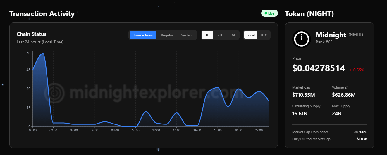 I keep thinking about the transaction activity graph I saw today. It wasn’t flat. There were clear peaks and valleys showing actual usage patterns. In the last 24 hours alone the network handled meaningful activity even before mainnet. When the genesis block drops and real value starts flowing, that graph is going to tell the story of Midnight’s growth. As an early holder I feel a quiet pride knowing I’ve been part of building this from the testnet days. The price is still low relative to the vision, the volume is healthy, and the infrastructure is ready. This is the moment where speculation starts turning into actual utility.