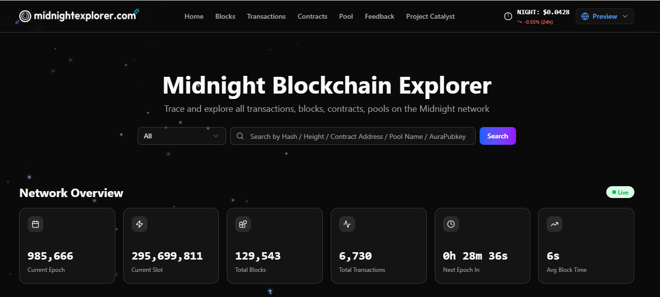 The little Live indicator was pulsing green like it always does, but this time it felt different. The announcement dropped today: Midnight is fully prepared for mainnet from block one. Preview and preprod versions are already live and stable. That means the moment the genesis block hits, we’ll have a complete, battle-tested explorer ready to track every shielded transfer, every ZK proof, and every real-world use case without missing a beat.