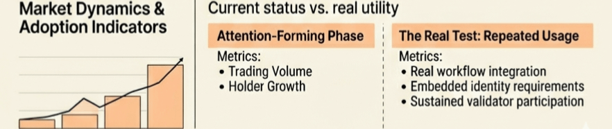 Sign enables platforms and coin like $SIREN to operate with verifiable identity layers, improving trust and transparency in on-chain trading and user interactions. But if identity becomes part of the foundational layer, it can support coordination across sectors such as finance, trade, and public services. Sign’s positioning as digital sovereign infrastructure suggests an attempt to align with this broader shift. It is less about competing as another crypto project and more about fitting into a larger economic transition where digital systems need to be both scalable and verifiable. Looking at the market side, the project still appears to be in a phase where attention is forming rather than stabilizing. Activity tends to increase during narrative cycles, which is common for infrastructure-focused projects that are not yet deeply integrated into everyday workflows. Metrics like trading volume and holder growth can indicate rising awareness, but they do not necessarily confirm that the system is being used in a meaningful way. In situations like this, the market often reflects expectations about future adoption rather than current utility. That gap becomes important because it defines how much of the valuation is based on belief versus actual usage. But this is where the real test appears. The biggest challenge is not explaining digital sovereignty or even building the technical system. It is ensuring that identity becomes part of repeated economic interactions. Because if applications do not integrate identity in a way that users rely on consistently, the infrastructure remains underutilized. And if usage does not reach a certain threshold, the connection between the token and real demand weakens.