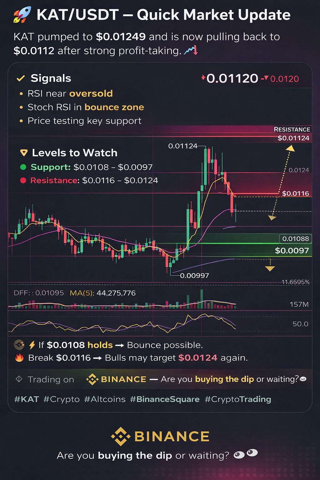 KAT pumped to $0.01249 and is now pulling back to $0.0112 after strong profit-taking. 📉