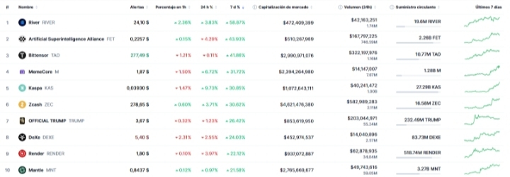 Entre os mais 5 destacados aparecem $RIVER (rio), aliança de superinteligência artificial $FET (FET), bittensor $TAO (TAO), memecore#memecore (M) e kaspa (KAS)#KAS