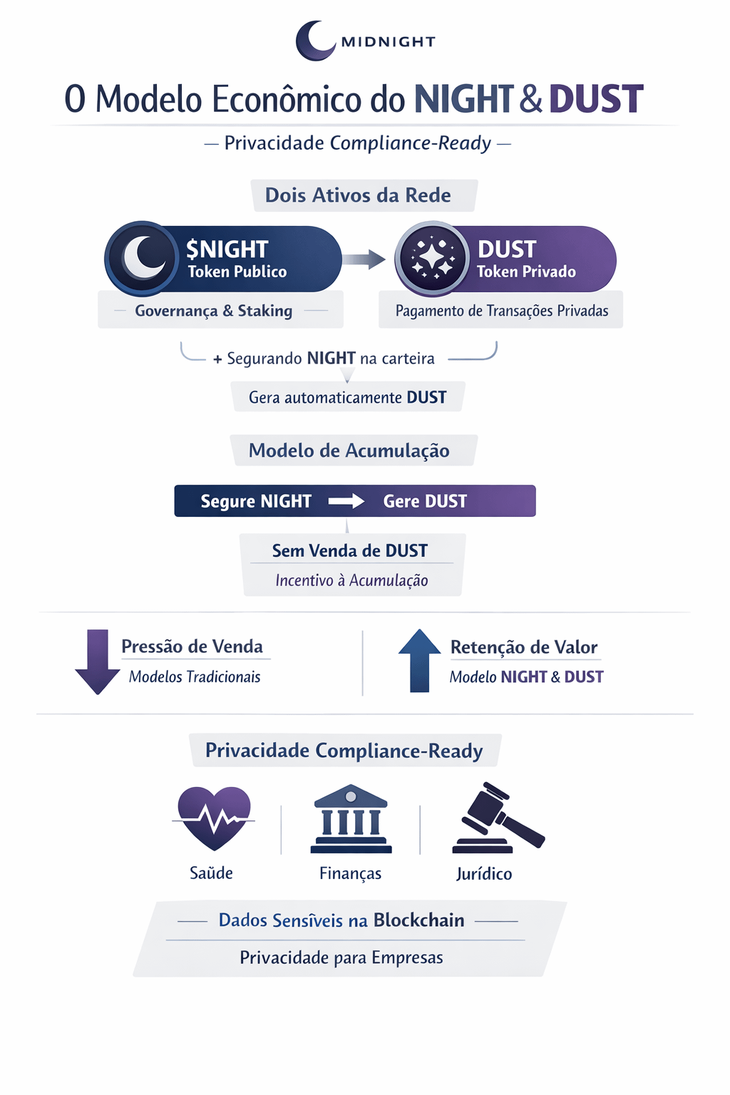 Por que isso importa? Porque em praticamente toda rede que usa um token de gas, existe uma pressão constante de venda. Quem precisa usar a rede precisa comprar o gas token, usar, e quem minera/valida frequentemente vende. É um ciclo que corrói preço. O modelo do NIGHT quebra esse ciclo. O DUST nasce do NIGHT mas não cria venda de NIGHT. Quem quer usar a rede precisa segurar NIGHT pra gerar DUST. Isso cria incentivo de acumulação, não de rotatividade especulativa.