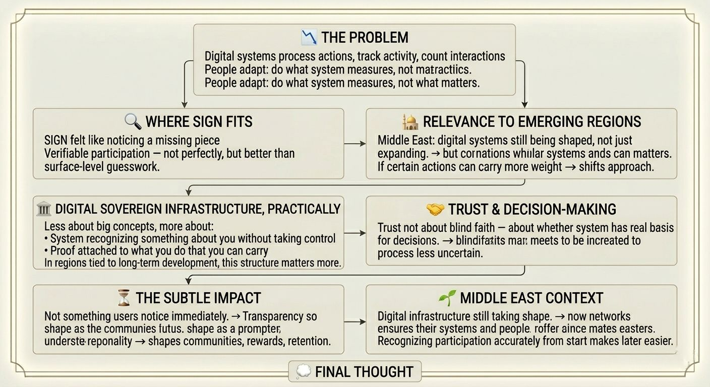 When I started looking into SIGN, it didn’t immediately feel like something big or disruptive. It felt more like noticing a missing piece that had been there for a while. The idea that some parts of participation could be verified in a more meaningful way not perfectly, but better than just guessing based on surface-level activity changes how you think about these systems. It’s not about tracking more data, it’s about making certain things count in a way that doesn’t get lost as soon as they happen.