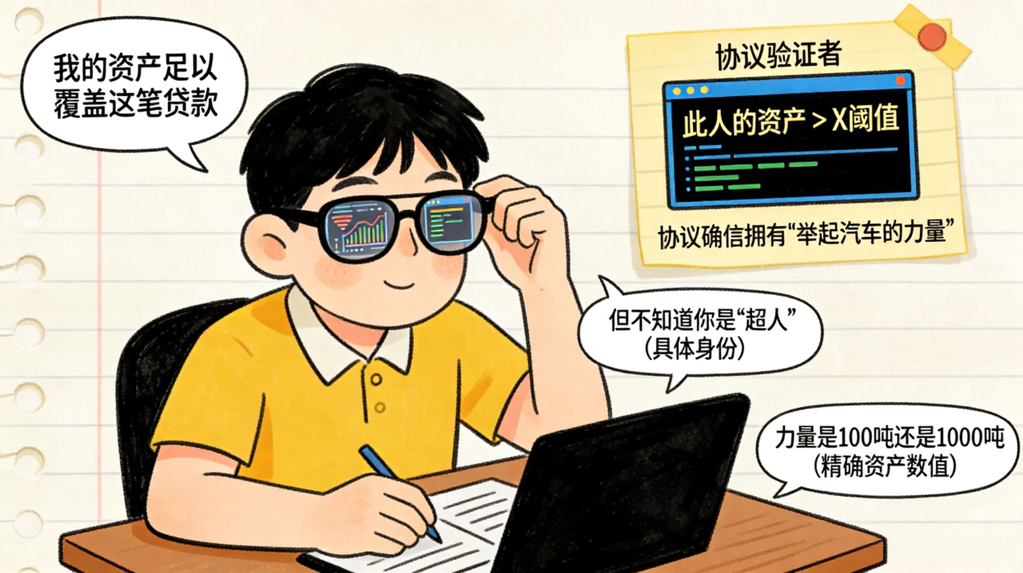 当你需要行使“超能力”时—比如向一个借贷协议证明“我的资产足以覆盖这笔贷款”——你不需要公开你的完整资产负债表(撕开衬衫)。你只需要“推一下眼镜”:运行一个零知识证明电路。这个电路会向协议(验证者)输出一个确凿无疑的信号:“此人的资产 > X阈值。” 协议瞬间“看见”并确信你拥有“举起汽车的力量”,但它依然不知道你是“超人”(你的具体身份),也不知道你的力量具体是100吨还是1000吨(你的精确资产数值