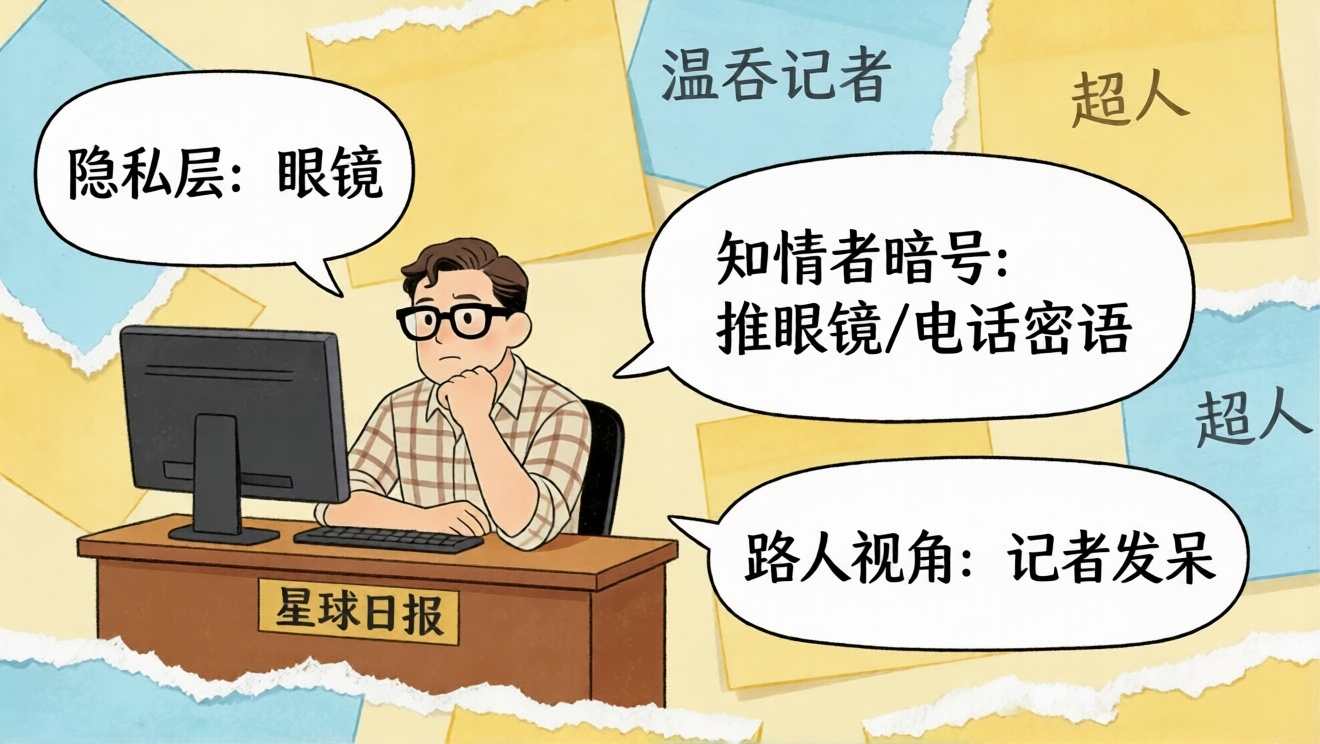 克拉克·肯特戴上眼镜,在《星球日报》是个温吞的记者。没人会把他和那个能举起汽车、目射热线的超人联系起来。眼镜是他的“隐私层”。但当他需要证明自己“力大无穷足以救人”时,他不需要当众撕开衬衫、露出胸口的“S”标志。他可能只需要在电话里说一句暗号,或者推一下眼镜——知情者就会瞬间明白“是他” 而周围的路人,依然只看到一个记者在发呆