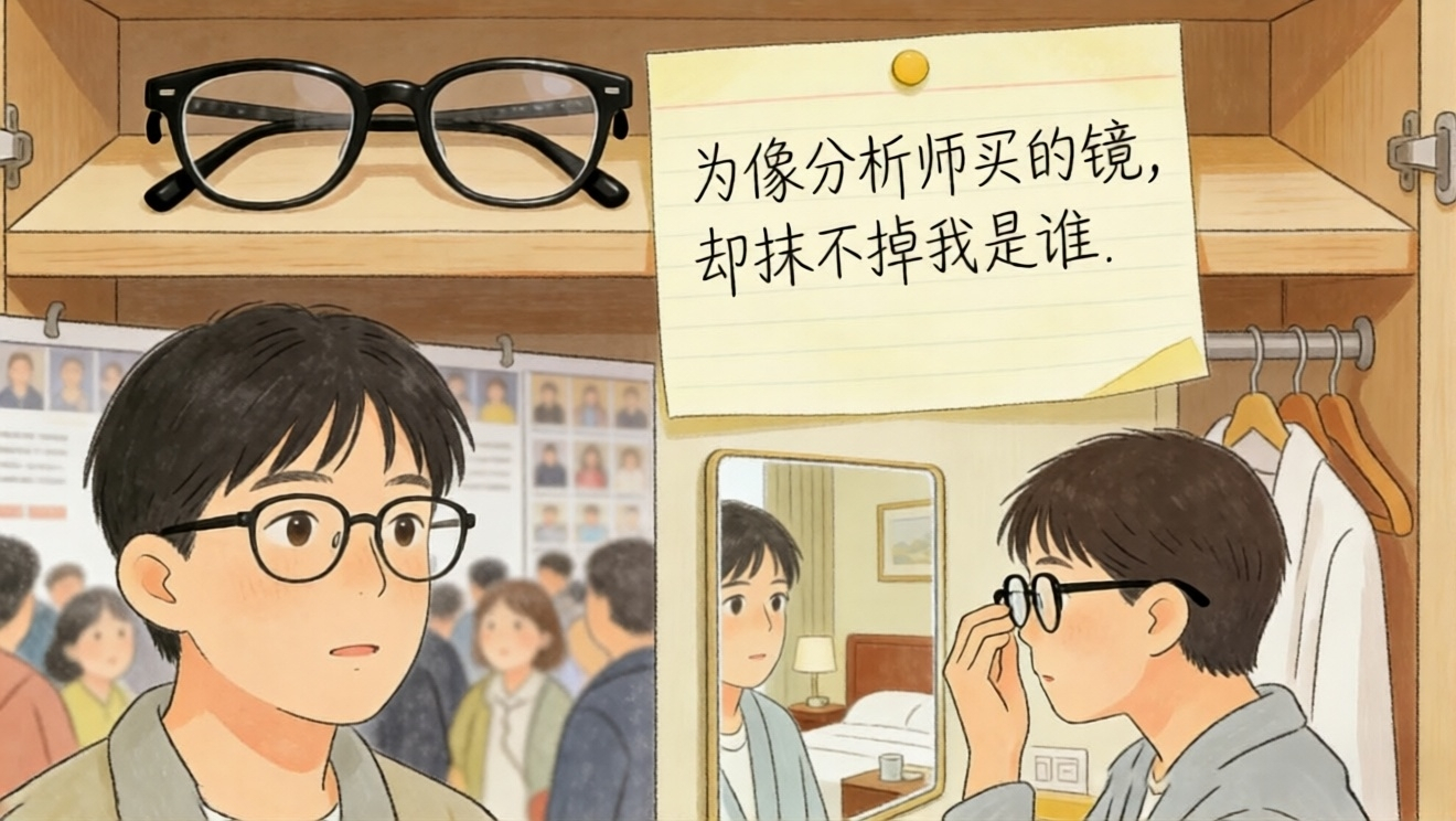 我衣柜深处,有副黑框平光镜,塑料的,镜腿有点松,很多年前跑会,为了让自己看起来“更像个分析师”买的戴上它,我在人群里就是个面目模糊的背景板,没人记得我。