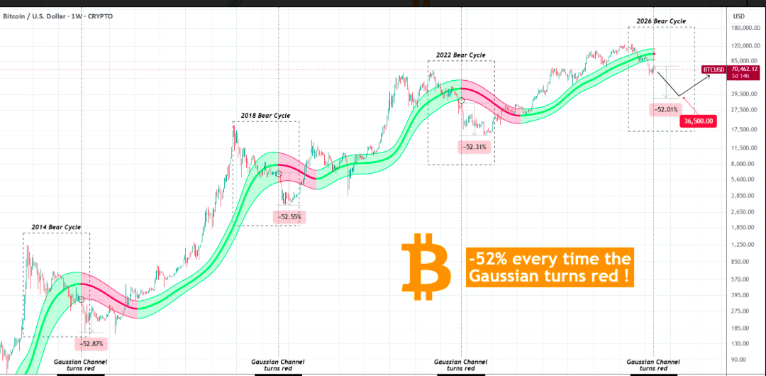 Whenever the Gaussian Channel flashes red, Bitcoin doesn’t just pull back—it crashes.