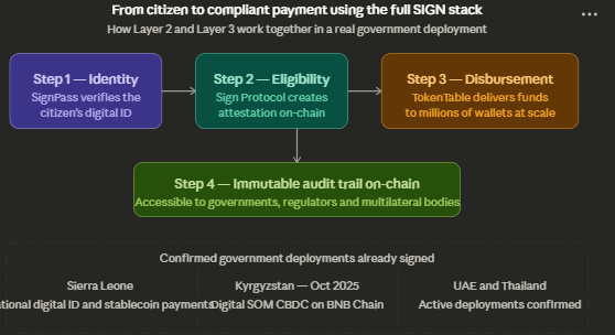 Layer 2 is Sign Protocol which handles omni-chain attestations and runs SignPass, a portable verifiable digital identity that a user can carry across any chain. Layer 1 is the Dual Sovereign Chain providing the settlement infrastructure underneath. And Layer 3, TokenTable, handles the actual movement of value to verified, eligible recipients at scale.