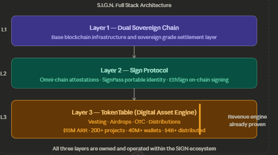 The part that I think most analysis gets completely wrong is treating TokenTable as a standalone product that SIGN happens to own. That framing misses everything. TokenTable is Layer 3 in a three-layer architecture and when you understand what the other two layers do the whole picture looks completely different.
